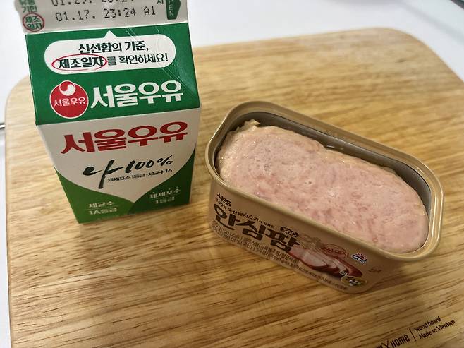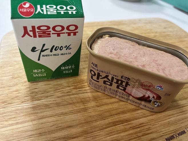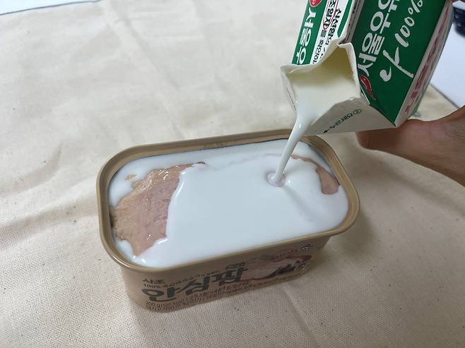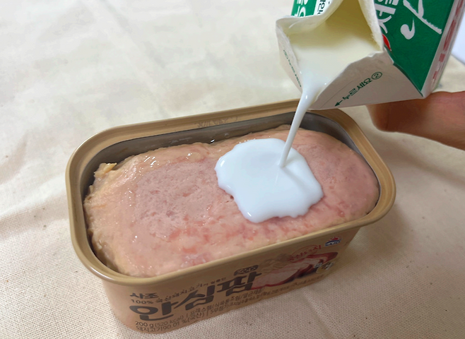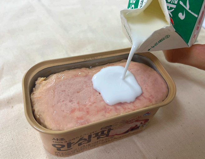 통조림 햄을 먹기 전 우유에 담가보세요. 특히 유통기한이 지나서 먹기 애매한 우유를 활용하면 좋습니다.