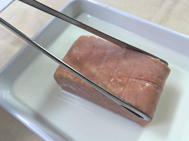 그래서 햄 특유의 냄새나 기름기가 싫다 하시는 분들은 통조림 햄 드시기 전 이 과정을 수행해 주세요. 또한 짠맛도 살짝 중화되어 햄을 담백하게 즐길 수 있습니다.