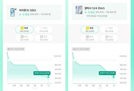 2024년에 출시된 기본 모델인 아이폰 15와 갤럭시 S24의 중고 구매 가격만 비교해 봐도 최소 10~20만 원가량 차이가 나는 것을 확인할 수 있습니다.