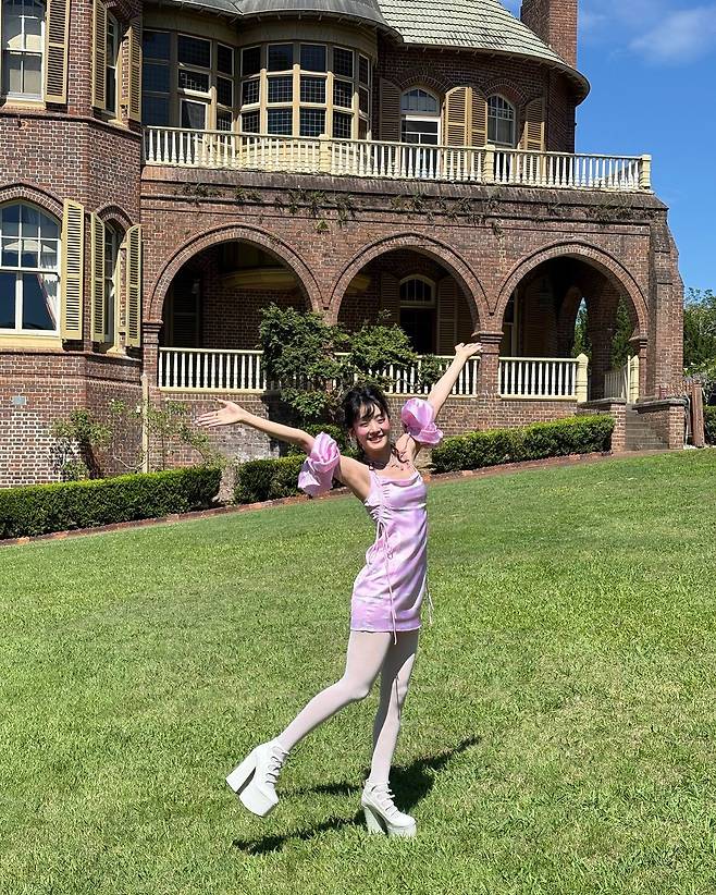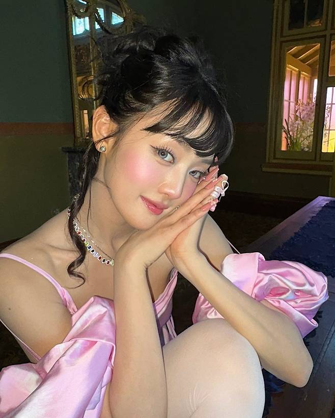 공개된 사진 속 민니는 핑크 컬러의 드레스를 입고 잔디 위에서 자유로운 포즈를 취하고 있다. 소매가 풍성하게 디자인된 드레스는 그녀의 러블리한 매력을 더욱 강조한다. 핑크와 화이트의 조화는 그녀만의 독특한 개성을 부각시키며, 전체적인 룩에 완벽한 밸런스를 더한다.
