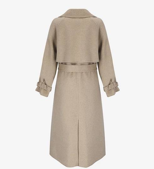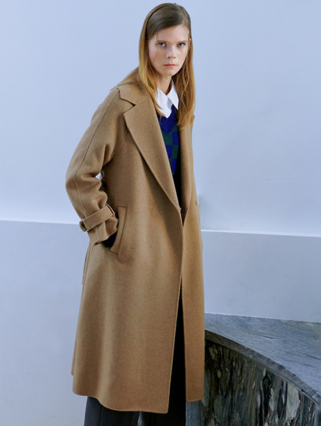 트렌치 코트의 볼륨감 있는 요크 백 플랩 디자인이 눈에 띄는 더블 핸드메이드 코트 제품으로 맵시있는 얼죽코 스타일을 연출한다.