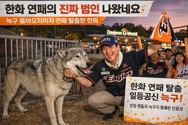 대전 오월드에서 탈출했던 '늑구'가 17일 새벽 무사 귀환했고, 18일 한화는 롯데를 5-0으로 완파하며 6연패 사슬을 끊었다. 같은 날 K리그1 대전 하나시티즌도 FC서울을 1-0으로 꺾으며 3연패에서 벗어났다. 늑구의 축복인가.