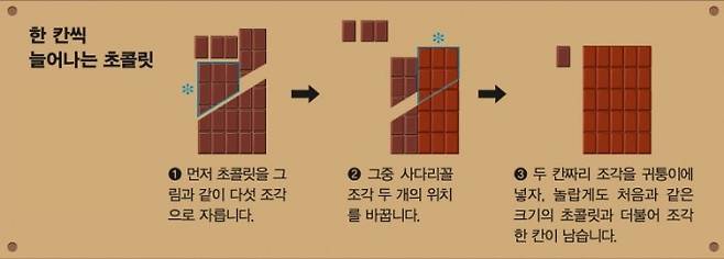 이는 근사한 속임수입니다. 큰 사다리꼴 조각이 왼쪽에서 오른쪽으로 이동하며 크기가 살짝 커졌기 때문입니다. 그럼 그렇지, 어떻게 주어진 도형을 다섯 개의 조각으로 쪼갠 뒤 이리저리 옮기는 것만으로 도형이 더 커지겠어요. 그런데 이것이 바나흐-타르스키 정리와 일맥상통합니다.