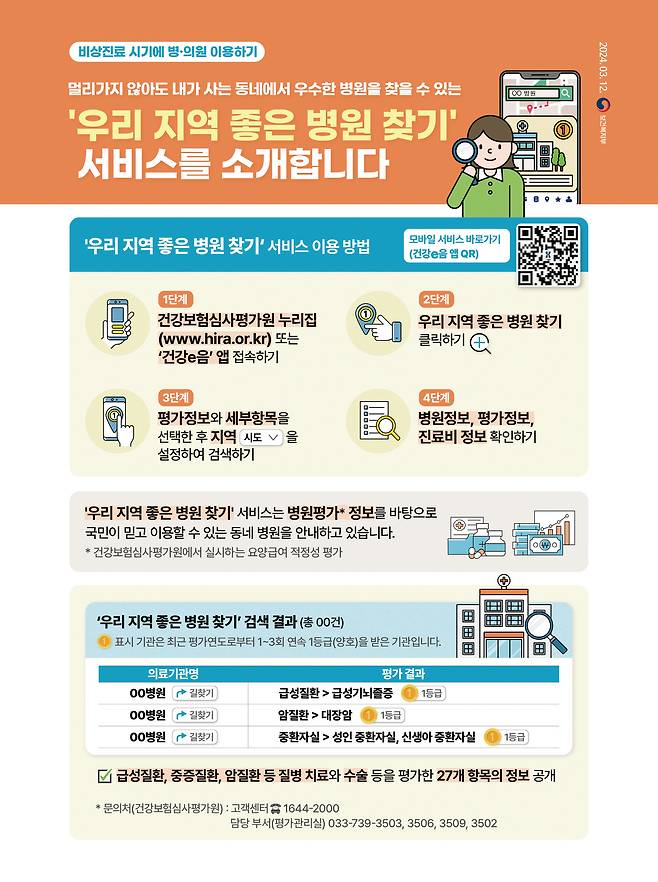 멀리가지 않아도 내가 사는 동네에서 우수한 병원을 찾을 수 있는 ‘우리 지역 좋은 병원 찾기’ 서비스를 소개해 드립니다. 자세한 내용은 '정책주간지 K-공감'에서 확인하세요.