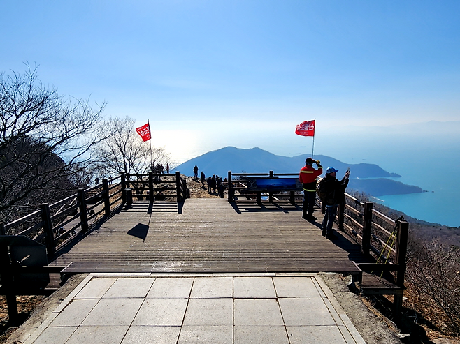 정상에 가까워질수록 거가대교가 한눈에 들어옵니다. 섬과 섬을 잇는 다리 너머로 거제도가 보이고, 그 사이 바다에는 아무것도 없는 듯 보이는데, 이 풍경을 보고 있으면 거가대교가 해저터널로 이어져 있다는 사실이 자연스럽게 떠오릅니다. 고도가 높아질수록 바닷바람에 실린 짠 내음도 한층 짙어집니다.