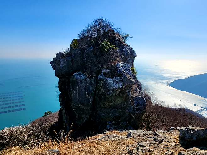연대봉 정상 아래 단단하게 자리 잡은 암봉은 이 산의 인상을 더욱 또렷하게 만들어 줍니다. 하늘과 바다의 경계가 흐려지는 지점에 서 있으면, 오르는 동안의 고단함은 어느새 잊히고 풍경만이 남습니다.