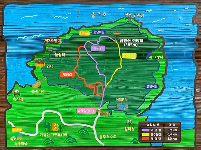 - 코스: 심항산 해맞이 도시숲 입구~충주호 출렁다리~원점회귀