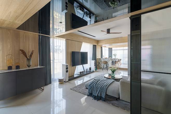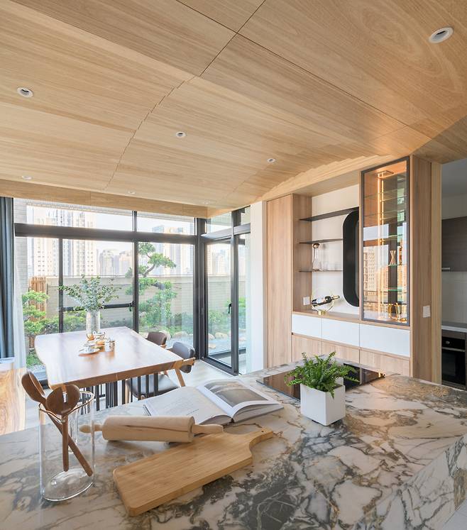 바닥부터 천장까지 이어진 유리 창은 테라스를 하나의 거실처럼 확장시키고, 원목과 메탈이 조화롭게 어우러져 감각적인 무드를 배가시킵니다.