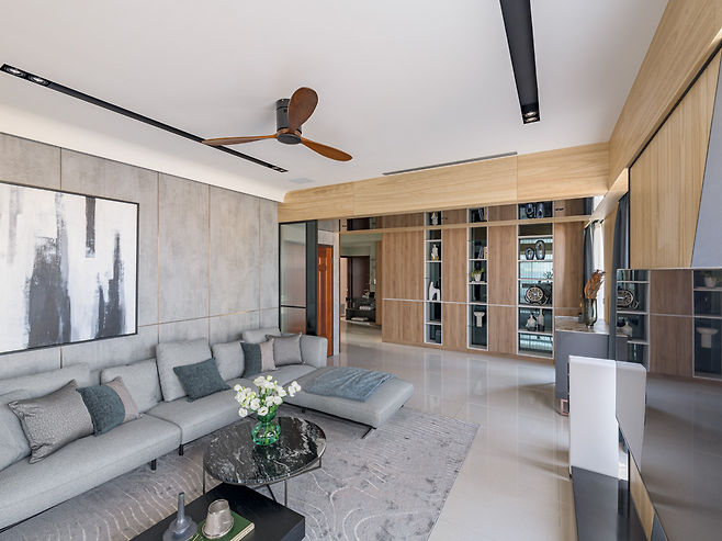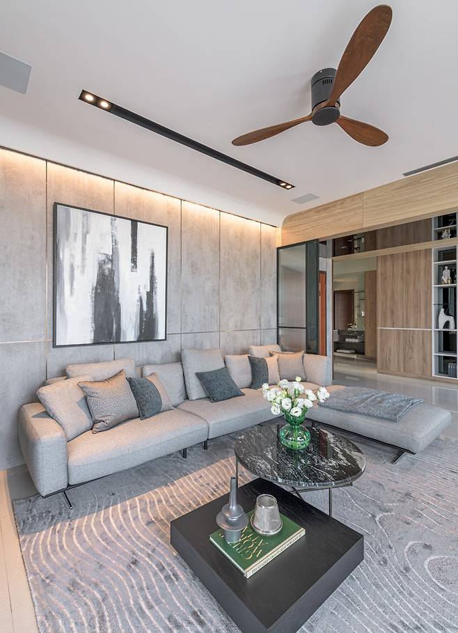 거실의 콘크리트 소파 벽은 자연광의 방향을 따라 깊이를 더하며, 미세한 조도로 가족의 하루를 부드럽게 감쌉니다. 곡선형 천장과 선별된 조명은 시선을 분산시키는 대신, 자연스럽게 시선이 안뜰로 흐르도록 유도합니다.