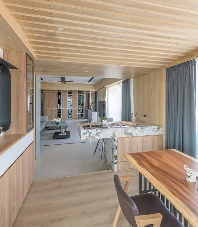 자연에서 영감을 받은 곡선 천장과 물고기 비늘 패턴은 따스한 리듬을 만듭니다. 대형 플래티넘 타일의 센터 아일랜드는 단단한 존재감으로 좌중을 사로잡고, 와인 캐비닛과 철제 선반은 소장품을 품위 있게 보관할 수 있도록 디자인되었습니다.