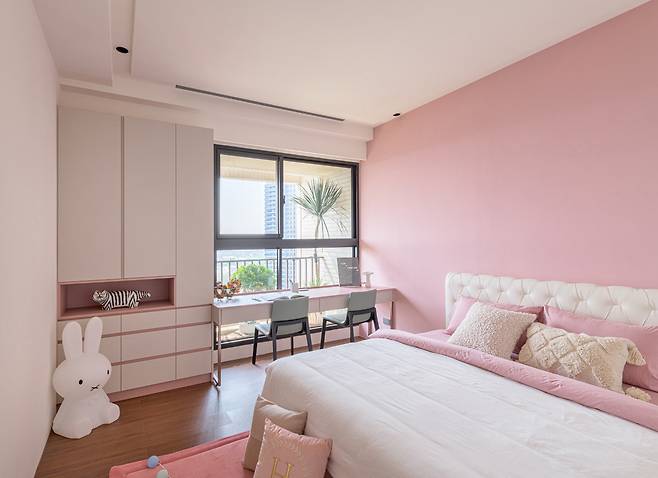 아이 방은 딸이 직접 고른 핑크 톤으로 꾸며졌습니다. 공부 책상은 탁 트인 창 앞에 둬 채광을 온전히 누릴 수 있도록 했고, 화사한 컬러와 적절한 수납으로 놀이와 학습 공간이 자연스럽게 공존합니다.