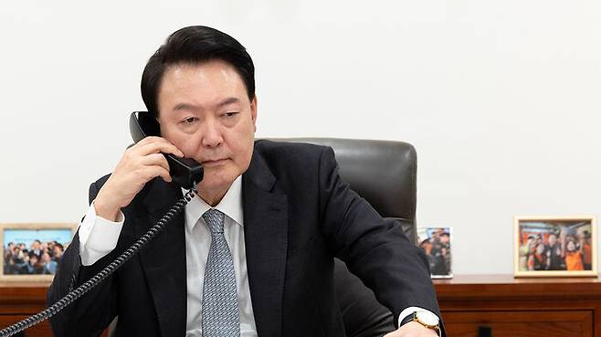 ▲ 윤석열 대통령이 10월 29일 서울 용산 대통령실에서 볼로디미르 젤렌스키 우크라이나 대통령과 전화 통화를 하고 있다.