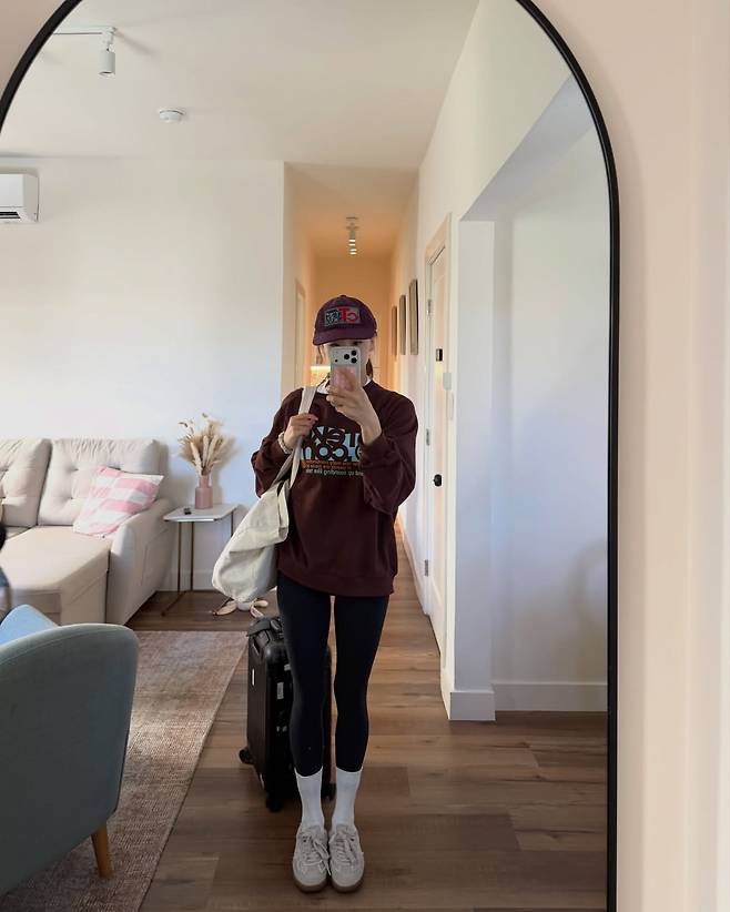 장거리 이동이나 여행 시 참고하기 좋은 실용적인 애슬레저 스타일이다. 깊이감 있는 버건디 컬러의 레터링 맨투맨 티셔츠에 블랙 레깅스를 매치하여 스포티한 매력을 발산했다. 레깅스 위로 흰 양말을 올려 신는 트렌디한 연출법이 눈에 띄며, 상의와 톤을 맞춘 보라색 볼캡으로 전체적인 룩의 균형을 맞췄다. 넉넉한 수납이 가능한 아이보리 캔버스 백은 편안함과 멋스러움을 동시에 챙긴 영리한 선택이다.