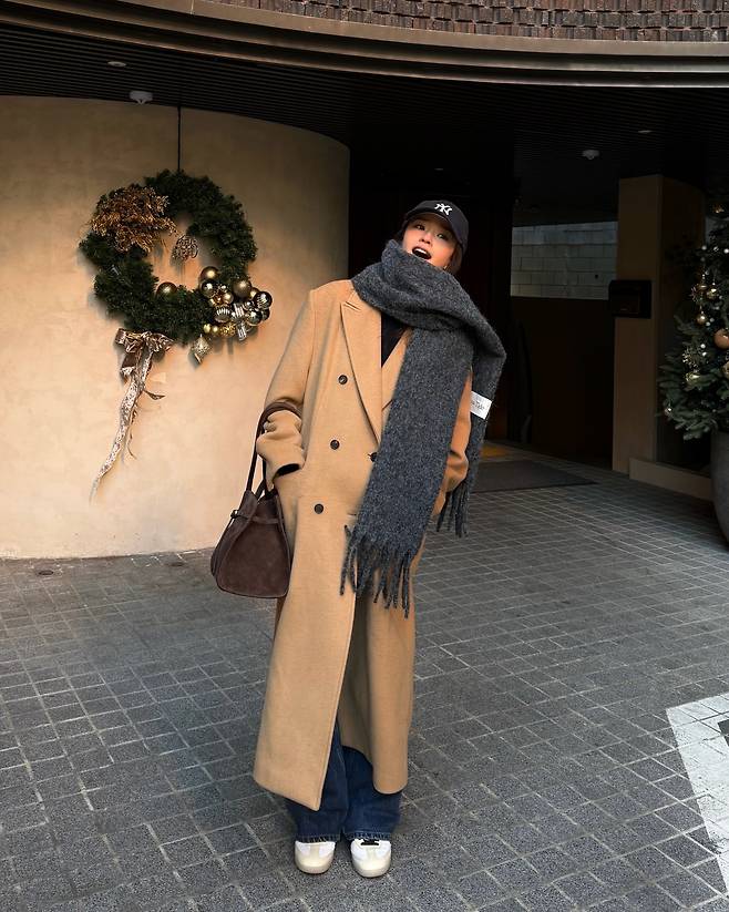 겨울 아우터의 기본인 롱 카멜 코트를 활용한 세련된 데일리 룩이다. 무릎 아래로 내려오는 클래식한 더블 버튼 코트에 와이드한 데님 팬츠를 매치해 차분하면서도 캐주얼한 분위기를 자아냈다. 여기에 짙은 회색의 두툼한 머플러를 무심하게 둘러 보온성을 높이는 동시에 시크한 멋을 살렸다. 자칫 무거워 보일 수 있는 코트 코디에 볼캡과 스니커즈를 믹스매치하여 경쾌한 리듬감을 부여한 점이 인상적이다.