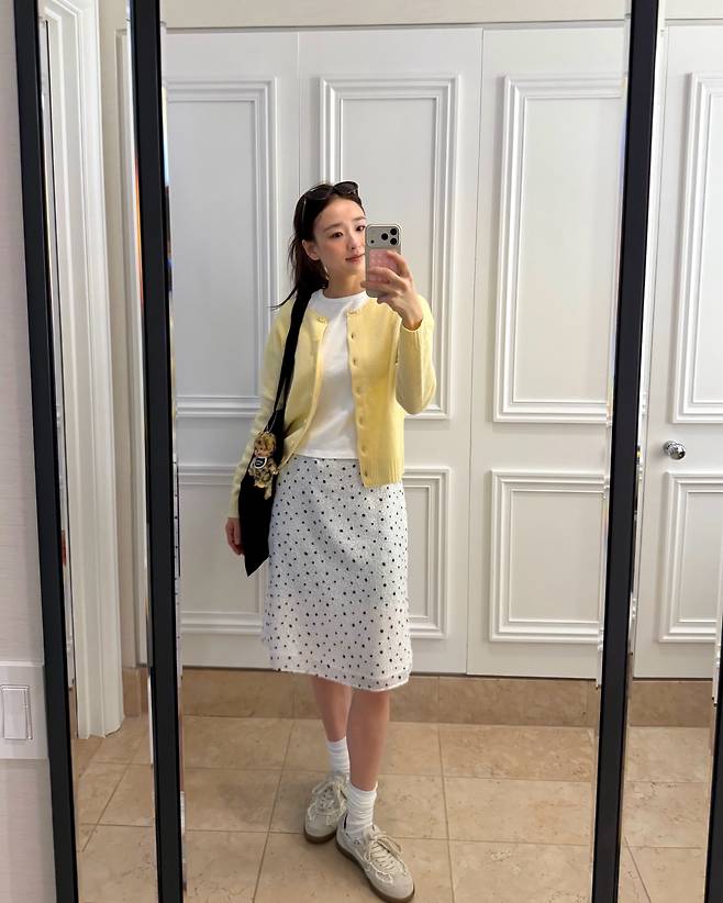 ## 상큼한 옐로 카디건과 도트 패턴의 조화