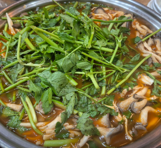 ▶ 얼큰한 국물에 미나리 고명을 얹어 쌈처럼 즐길 수 있어 특별함