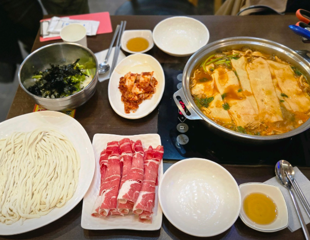 ▶ 얼큰샤브손칼국수 – 소고기 육수에 미나리, 고기, 버섯, 넙적 수제비와 칼국수면이 들어간 시그니처 메뉴