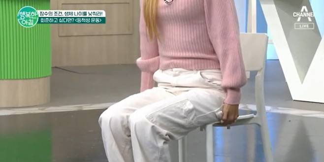 1. 의자에 앉아 팔은 의자를 당기고 두 다리는 힘을 줘 바닥을 누른다.