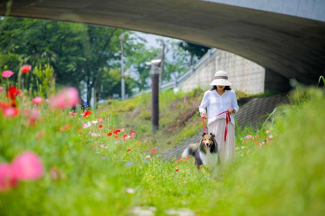 5월에는 양귀비꽃이 오수천 주변을 붉게 수놓으며 화려한 산책길로 변신하여 반려견과 반려인 모두가 만족할 수 있는 5월 가볼 만한 곳이랍니다.