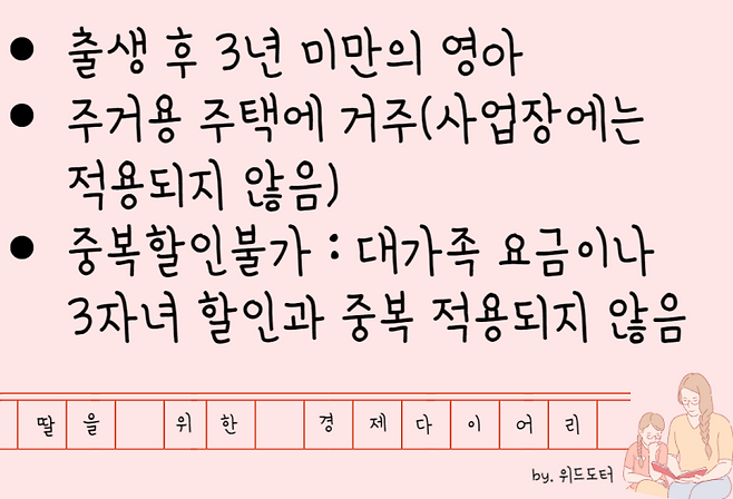 이 혜택은 출산, 입양 등으로 인해 출생한 영아가 포함된 가구에 적용되며, 주거용 주택에 거주하는 경우에만 해당됩니다. 중복 할인이 불가능하고 대가족이나 3자녀 이상인 가구도 비슷한 헤택을 받을 수 있어요.