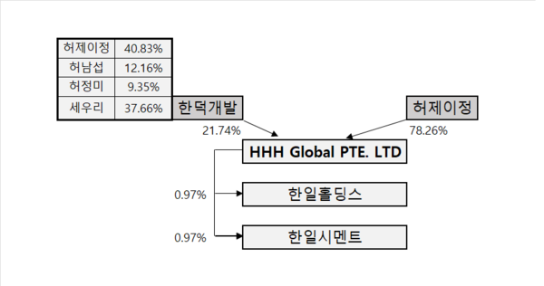 한일홀딩스와 한일시멘트가 배당을 확대한 가운데 지난해 양사의 신규 주주로 등장한 HHH글로벌유한회사도 혜택을 보게 됐다. 고(故) 허채경 창업주의 4남인 허남섭 한일시멘트 명예회장은 지난해 3분기 자신이 보유한 한일홀딩스 주식 30만주(0.97%)와 한일시멘트 주식 50만주(0.97%)를 HHH글로벌에 증여했다.