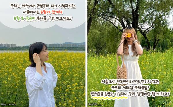 유채꽃으로 유명한 제주도에서는 2월부터 노란빛으로 물들기 시작하지만, 서울에서는 조금 늦은 5월에 만개하며 5월 초, 중순이 유채꽃구경 피크라고 할 수 있습니다.