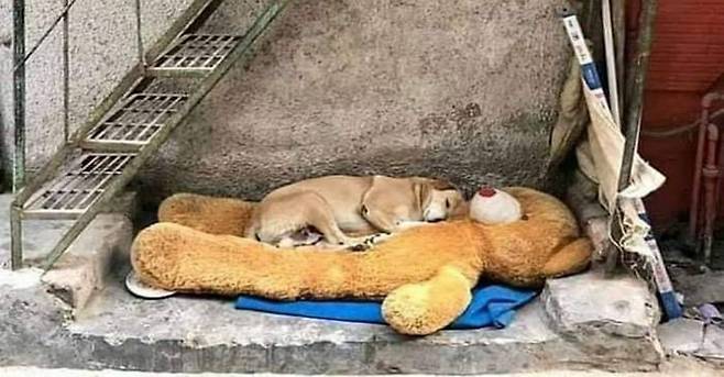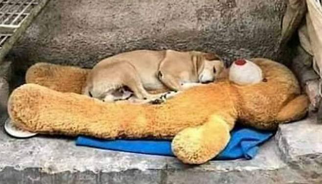 "누군가의 쓰레기는 다른 강아지에게 보물입니다"라는 짧은 글과 함께 게시된 이 사진은, 더 이상 주인의 사랑을 받지 못해 버려진 인형과 가족을 잃고 떠도는 강아지가 서로의 온기를 나누는 듯한 묘한 유대감을 느끼게 합니다.