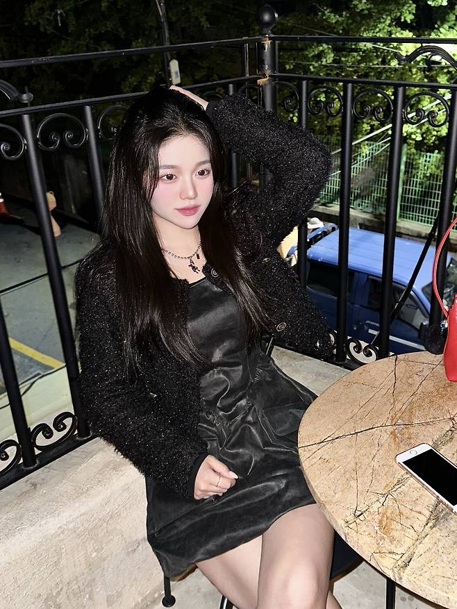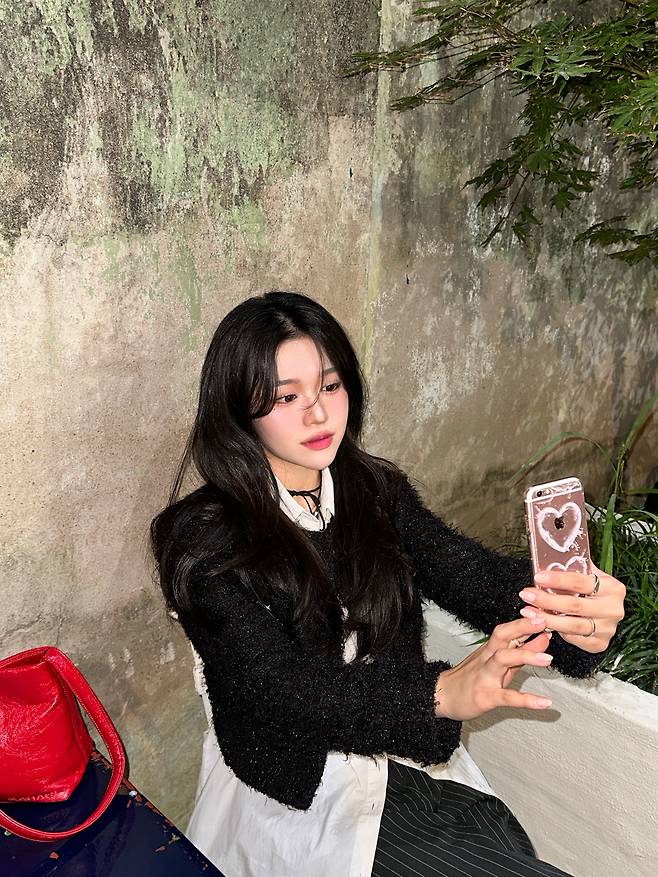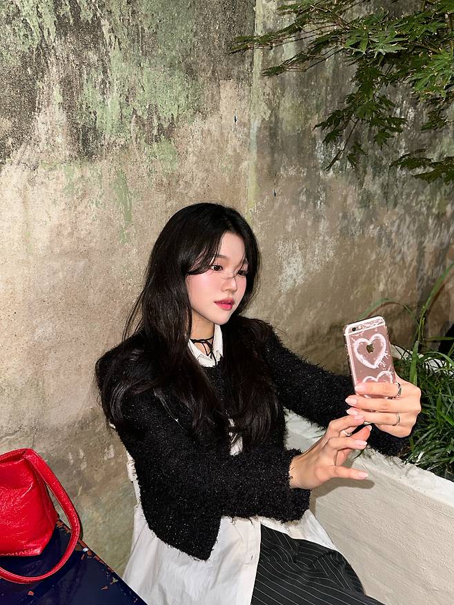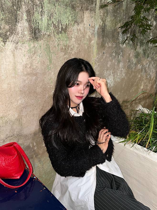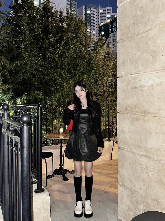 블랙 레더 원피스&트위드에 레드 가방 착장