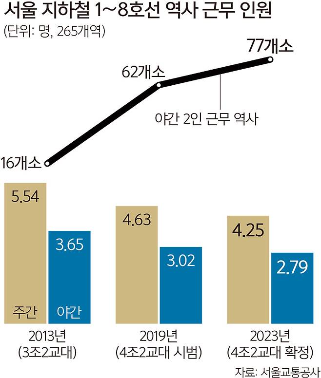 1~8호선 265개 역사 중 야간근무 인원이 2명에 불과한 역도 2013년 16곳, 2019년 62곳에서 올해 77곳까지 증가했다. 이 가운데는 하루 평균 승하차 인원이 3만명을 상회할 정도로 붐비는 역사도 포함돼 있다. ‘주야비휴(주간→야간→비번→휴무)’의 4일 주기 교대근무를 도입하면 3조2교대 대비 야간근무가 줄고 휴일이 늘어 조별 근무인력이 감소한다. 공사가 기존 정원 내에서 무리하게 근무제 전환을 추진하다가 이 같은 인력 공백이 생긴 것으로 분석된다.