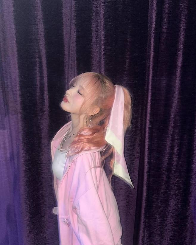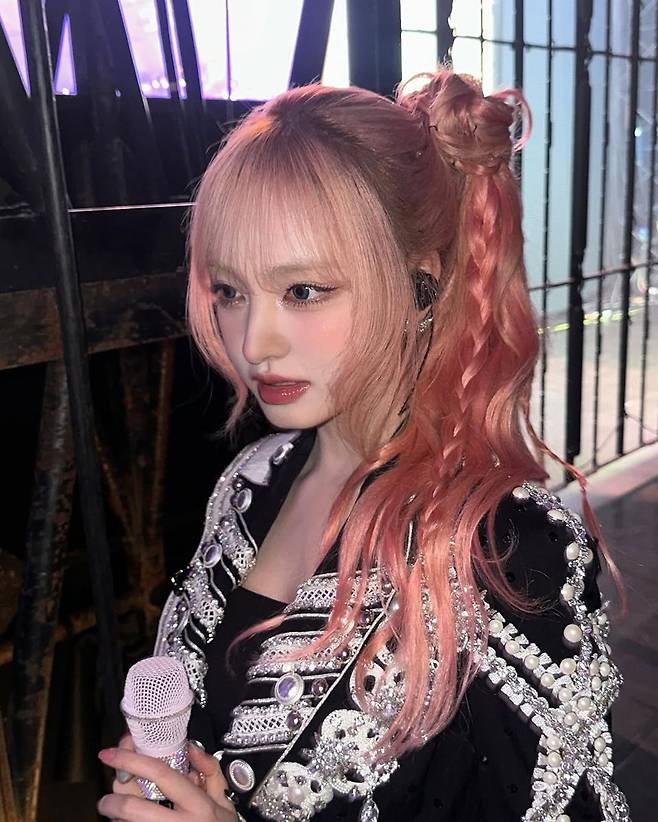 상체는 바디라인을 강조하는 짧은 재킷 형태로, 볼드한 단추와 비즈 디테일이 더해져 무대 의상 못지않은 완성도를 보여준다. 하의는 하이웨이스트 팬츠에 체인 디테일이 더해진 디자인으로, 전체 룩에 리듬감을 부여하며 트렌디한 감성을 극대화했다. 헤어는 핑크빛 그라데이션 컬러에 양갈래로 묶어 스타일링해, 강렬한 의상과 대비되는 러블리한 무드를 균형 있게 더했다.