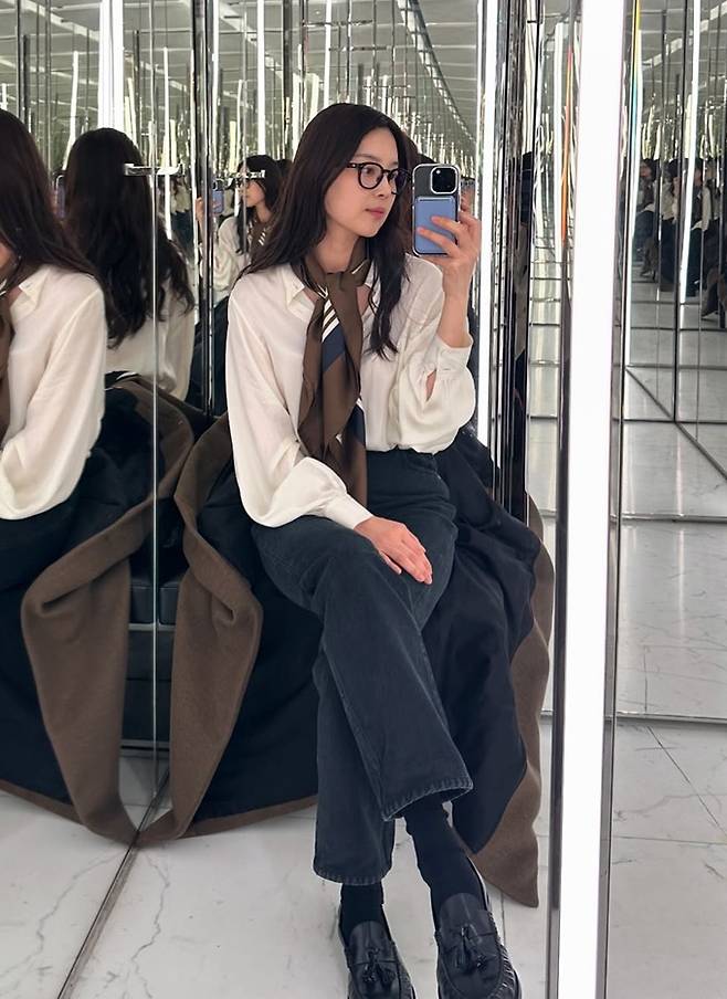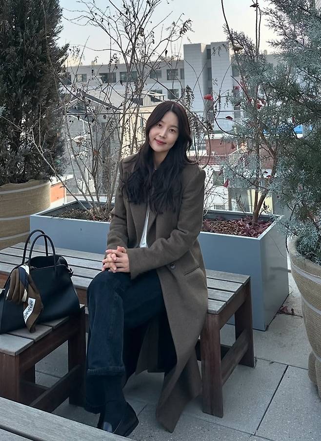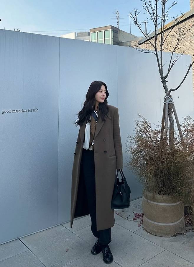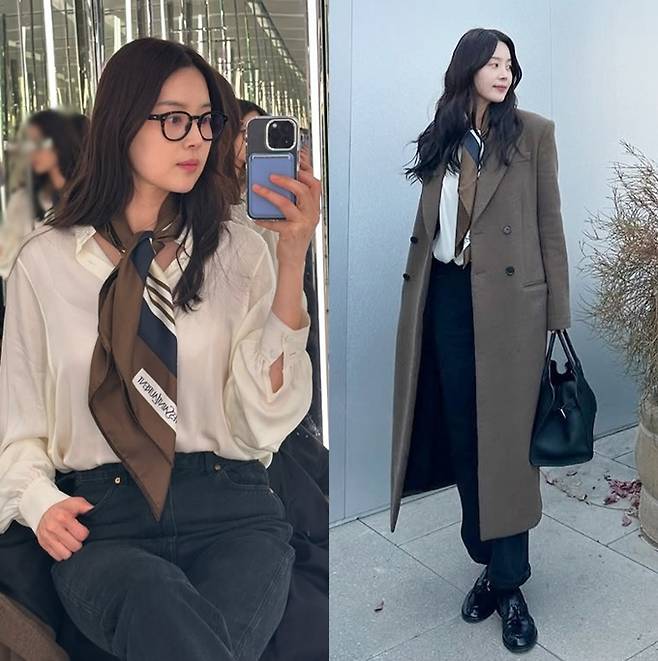 공개한 사진에서 한지혜는 글로벌 색채 전문기관인 팬톤이 2025년 올해의 컬러로 발표한 ‘모카무스(Mocha Mousse)’ 컬러 조합의 스카프와 코트 조합으로 환상적인 얼죽코룩을 연출했다.