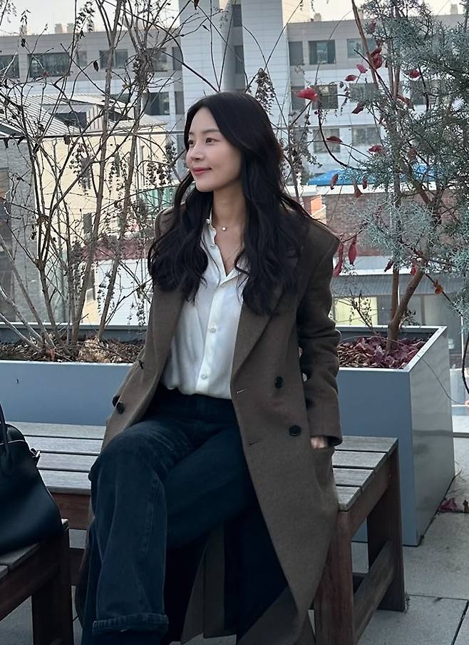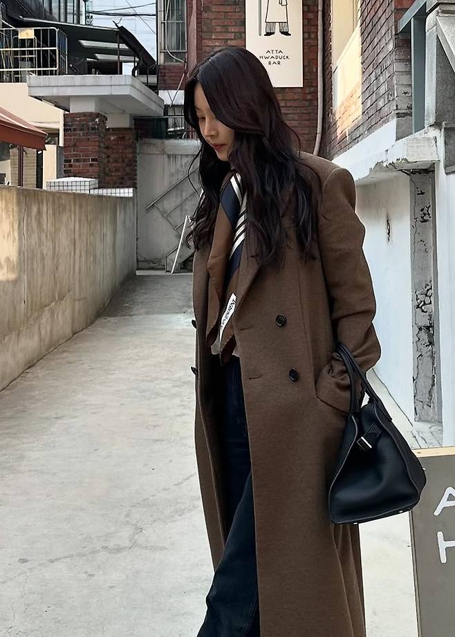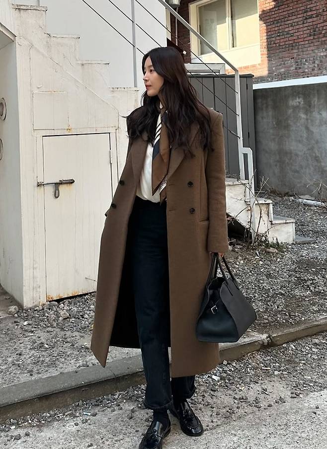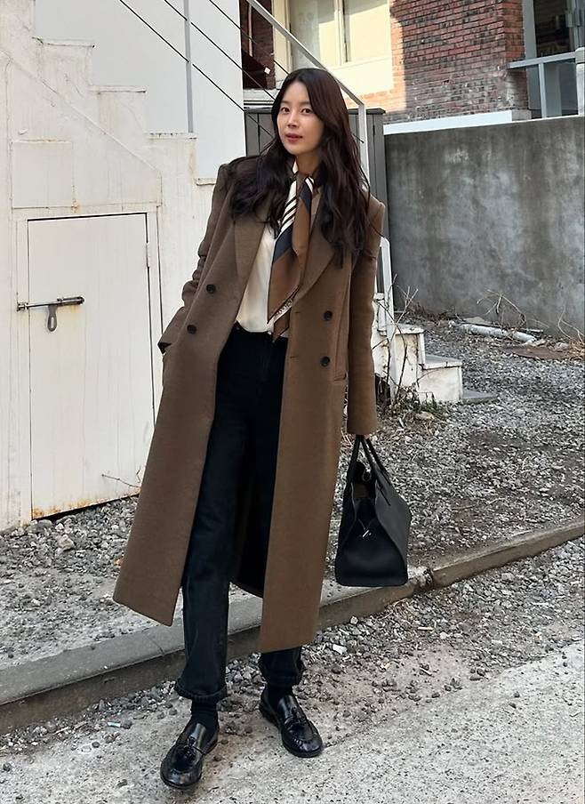 배우 한지혜가 올 트렌드 컬러인 모카무스 스카프와 코트 조합으로 감각적인 얼죽코룩을 완성했다.