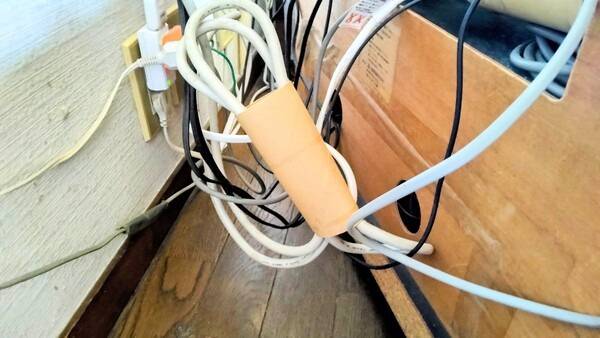 바깥에 네임펜으로 어떤 전선인지 적어두면 찾기도 쉽습니다. 별도의 전선 정리함 없이도, 전선 더미를 깔끔하게 정리할 수 있는 방법이에요.