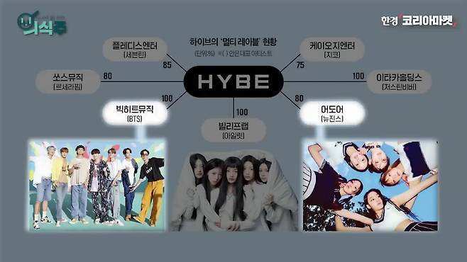 요즘 제일 핫한 걸그룹 뉴진스의 소속사 어도어는 하이브 소속 레이블 중 하나입니다. 레이블은 독립성을 보장해주기 위해 하이브가 구축한 체제인데, 자회사 격입니다. 하이브가 어도어 지분 80%를 들고 있고 민 대표가 18%, 다른 어도어 직원들이 2%를 보유하고 있습니다.