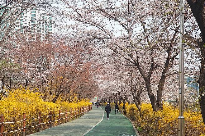 반포한강공원 근처에 위치한 ‘허밍웨이길’은 한강을 따라 조용히 펼쳐진 산책로로, 벚꽃과 개나리가 흐드러지게 피어 있어 감성적인 산책을 즐기기에 좋다.