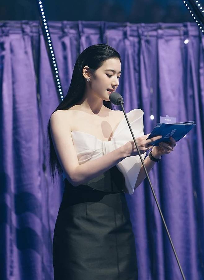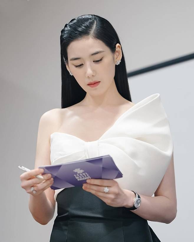 정은채는 여성스러움과 예술적 감각이 동시에 드러난 오프숄더 화이트 리본 디테일에 비대칭 디자인의 블랙 롱 드레스를 착용한 블랙&화이트 스타일로 아름다운 조각미를 드러냈다.