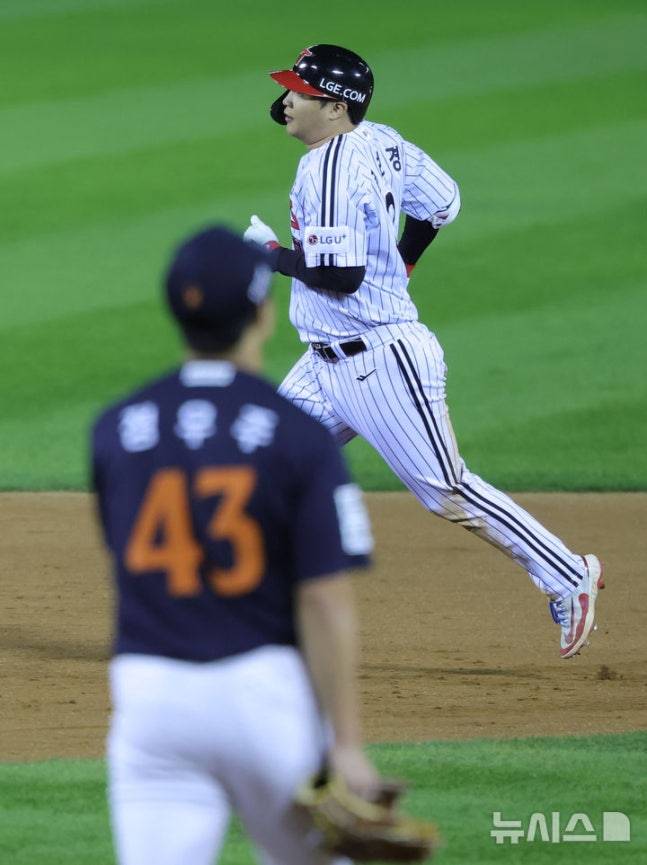 선두타자 신민재를 2루수 땅볼로 처리한 뒤 오스틴 딘에게 볼넷을 내준 정우주는 문성주도 2루수 땅볼로 막고 2번째 아웃카운트를 챙겼다. 하지만 이날 가장 타격감이 뜨거운 문보경은 넘어서지 못했다. 볼카운트 1-1에서 던진 3구째 150km/h 패스트볼이 한가운데 실투가 돼 투런포를 허용했다. 2경기 연속 2실점을 기록한 정우주는 오지환을 루킹 삼진으로 돌려세우고 1이닝 투구를 마무리했다.