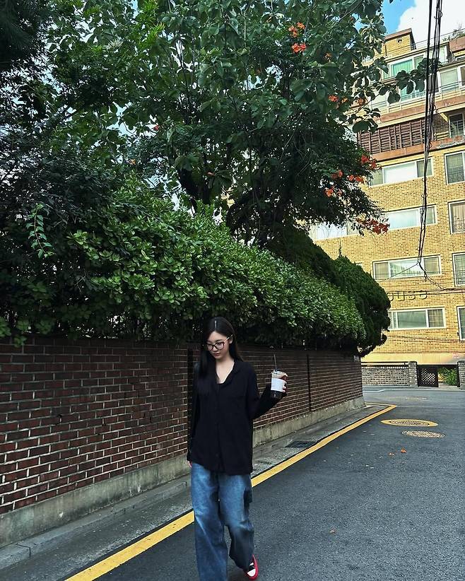 두 번째 룩은 완전히 다르다. 스트리트 무드가 느껴지는 블랙 셔츠와 워싱이 독특한 루즈핏 데님 팬츠. 무심하게 내린 생머리와 블랙 뿔테 안경까지 더해지니 도회적인 무드가 한껏 살아난다. 마치 뉴욕의 어느 골목을 걷는 듯한 분위기. 여기에 한 손에 커피를 든 모습은 평범한 일상 같지만, 그 자체로 스타일링의 완성이다. 뭔가 특별한 걸 하지 않아도, 그냥 걸어다니기만 해도 분위기가 난다.