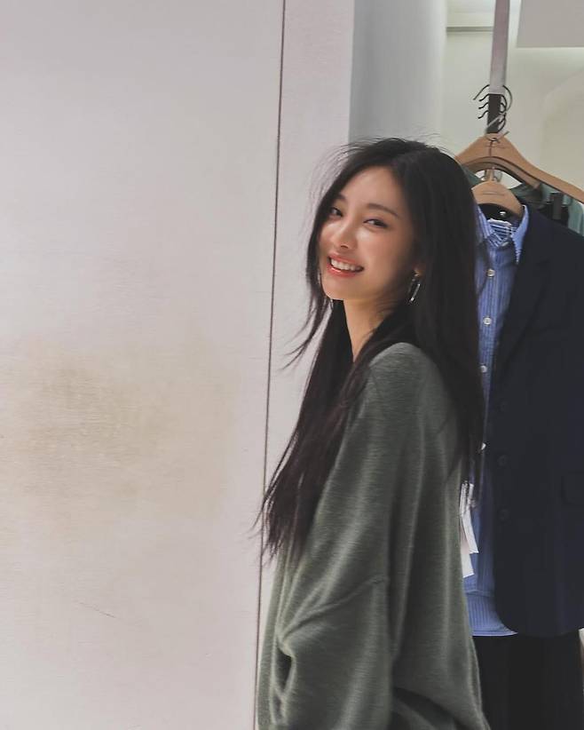 첫 번째 룩은 어깨선이 자연스럽게 떨어지는 루즈한 카키 컬러 니트. 안에 아무것도 받치지 않은 듯한 그 편안한 실루엣은, 일상 속 여유로움을 그대로 드러낸다. 바람에 흩날리는 긴 생머리, 살짝 비틀어진 시선과 미소까지. 닝닝의 미니멀한 매력이 가장 잘 드러난 순간이다. 꾸미지 않아도 빛나는 얼굴, 그리고 그 얼굴을 더 돋보이게 해주는 차분한 색감의 니트가 너무 잘 어울린다.