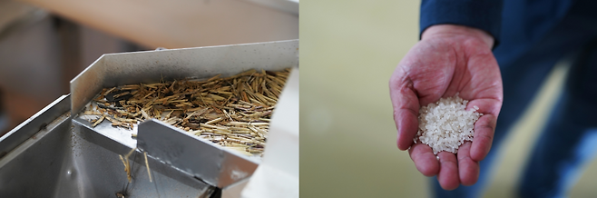 안쪽에서 벼가 투입되면 먼저 돌·금속 등 이물질 제거 작업이 이뤄진다. 1차 도정을 해 현미를 만들고, 현미가 다시 백미 공정으로 들어가 2차 도정을 거쳐 백미로 나온다. 이 대표는 “갓 도정한 쌀은 이렇게 따뜻하다”며 현미와 백미를 차례로 꺼내 보였다. 도정을 마친 쌀들은 배관을 타고 포장실로 이동한다. 최종 관문인 금속검출기까지 통과하면 로봇팔로 포장돼 대형마트, 온라인몰 등으로 출고된다.
