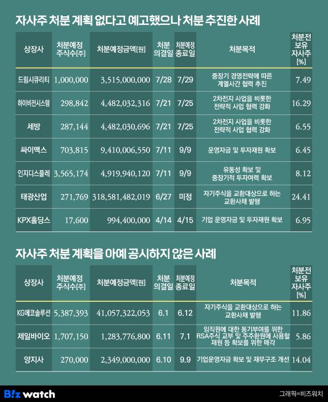 그러나 사업보고서에 '현재는 처분 계획이 없다'는 식으로만 기재한 후 돌연 자사주 매각에 나서는 일이 잇따랐다. 최대주주나 계열사를 대상으로 한 자사주 처분도 눈에 띄게 늘었다.