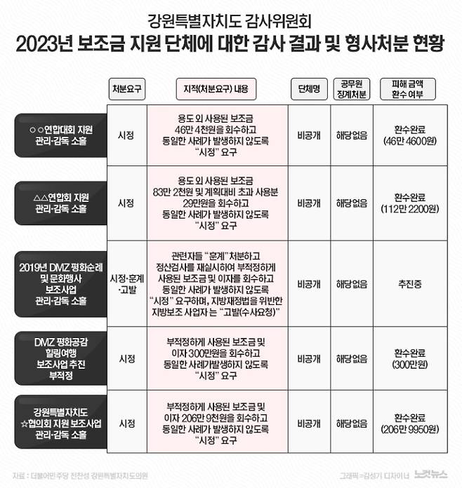 CBS노컷뉴스 취재진이 전찬성 강원특별자치도의원(더불어민주당·원주)을 통해 입수한 강원도 감사위원회 자료에 따르면 지난해 강원도 보조금 단체 중 사용 목적 외 유용 또는 횡령 등 부적정 사용이 적발된 사례는 총 5건이다.