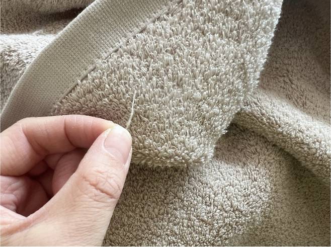 먼저 수건을 한 장씩 들어 올려보면 이렇게 실밥이 나와 있는 것들이 많이 보여요