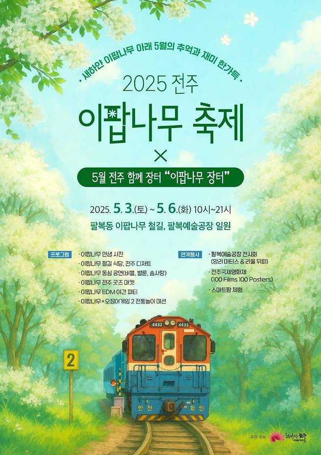 입장료는 무료이며, 축제는 전북 전주시 덕진구 팔복예술공장 일대에서 펼쳐진다. 흩날리는 이팝꽃처럼 따뜻하고 풍성한 봄날, 전주에서 감성 가득한 시간을 보내보자.