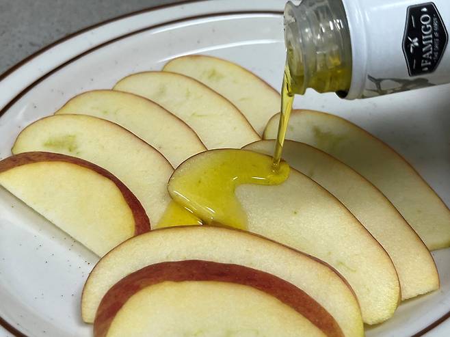 자른 사과는 접시 위에 펼쳐 올려 주세요. 한 끼에 적당한 분량은 중간 크기 사과 1개 정도입니다. 그리고 엑스트라버진 올리브 오일 1~2 스푼 뿌려 주세요. 올리브 오일의 풍미가 사과의 상큼한 단맛과 어우러져 조화로우며, 건강한 지방을 더해 포만감을 오래 유지할 수 있습니다.