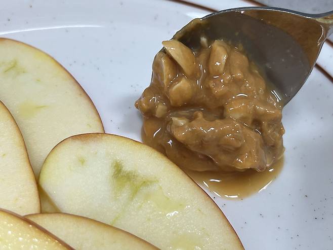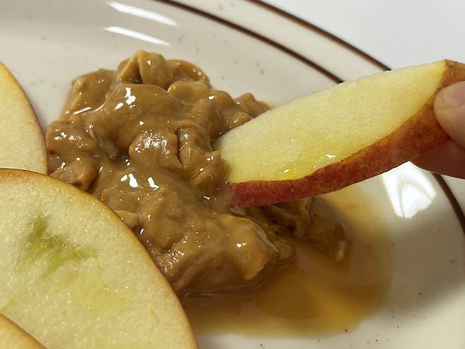 그리고 사과와 함께 땅콩버터를 곁들여 보세요. 땅콩버터의 고소하고 진한 풍미가 사과의 상큼한 단맛과 어우러져 최고의 단짠 조합을 만들어 줍니다. 특히 땅콩 식감이 씹히는 종류의 땅콩버터를 곁들이면 더욱 맛있습니다.