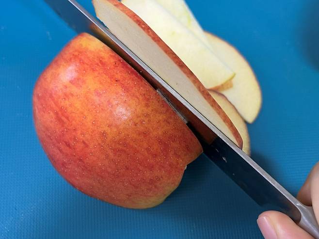 사과는 깨끗하게 세척한 후 얇게 썰어 줍니다. 사과 껍질에는 풍부한 식이섬유와 항산화 성분이 들어 있어 껍질째 섭취하는 것이 좋습니다.