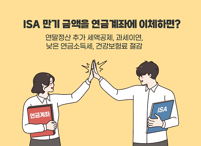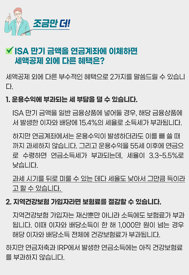 이와 별도로 ISA 만기 금액을 연금계좌로 이체하면, 이체한 금액의 10%(최대 300만 원)까지 추가로 세액공제를 받을 수 있습니다.