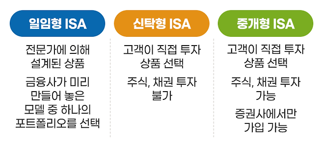 초기에는 고객의 구체적인 지시를 받아 금융회사가 운용하며 예∙적금, 펀드 등에 투자할 수 있는 신탁형 ISA와 고객이 금융회사가 제시하는 모델 포트폴리오를 선택해 운용하는 일임형 ISA로 시작하였습니다.