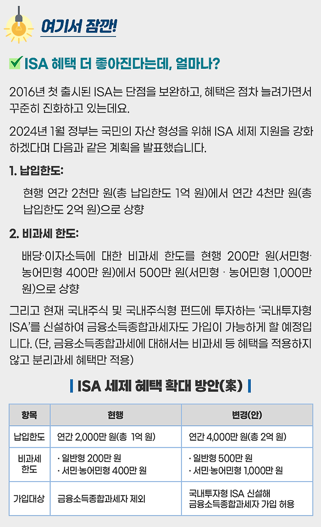 ISA는 원래 1999년 4월 영국에서 처음 시작되어 전 국민의 재산 형성을 위한 근간으로 자리 잡은 제도였는데, 이를 우리나라가 2016년에 도입한 것입니다.